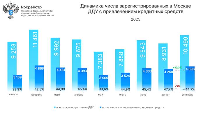 В сентябре 2025 года Управлением Росреестра по Москве зарегистрировано 4 696 договоров участия в долевом строительстве в отношении жилой и нежилой недвижимости с привлечением кредитных средств. При этом доля ипотечных сделок от общего числа оформленных в сентябре ДДУ составила 44,7%. Об этом сообщил Игорь Майданов, руководитель Управления Росреестра по Москве.