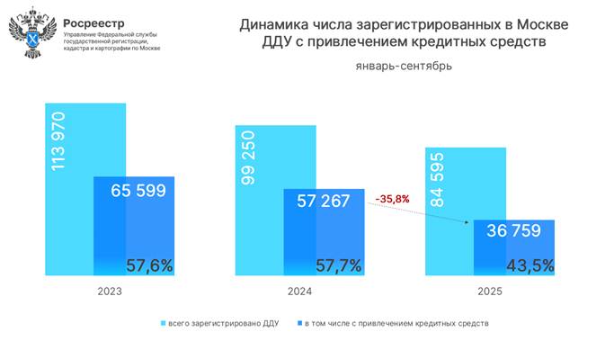 Всего за январь-сентябрь 2025 года Росреестром по Москве зарегистрировано 36 759 ДДУ с привлечением кредитных средств. К аналогичному периоду 2024 года (57 267 ДДУ) показатель снизился на 35,8%, а к 9 месяцам 2023 года (65 599 ДДУ) сократился на 44%. По итогам девяти месяцев 2025 года сделки с привлечением кредитных средств составили 43,5% от общего числа зарегистрированных ДДУ в жилом и нежилом сегментах первичного рынка недвижимости. Доля за аналогичный период прошлого года составляла 57,7%.