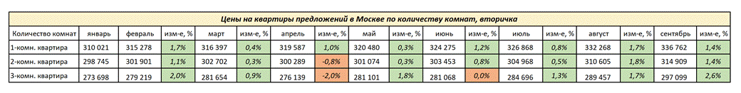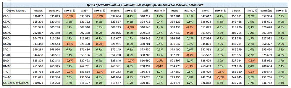 - Средняя медианная цена предложений на 1-комнатные квартиры составила 336 762 руб./кв.м., +1,4% с начала сентября месяца;