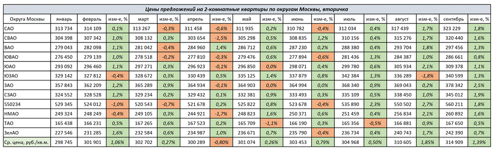 - Средняя медианная цена предложений на 2-х комнатные квартиры составила 314 909 руб./кв.м., +1,4% по сравнению с августом месяцем;