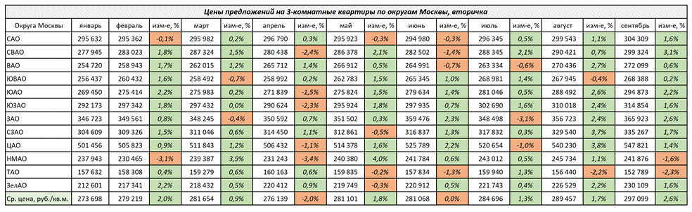 Средние цены предложений на 3-комнатные квартиры показаны в таблице ниже:
