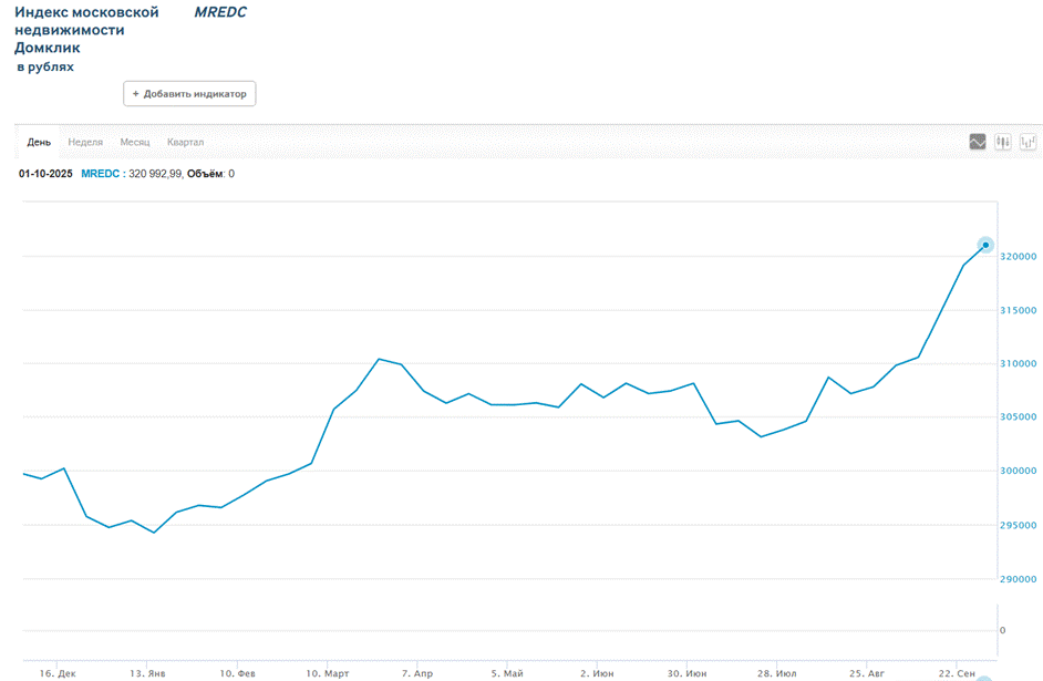Индекс московской недвижимости Домклик (MREDC), рассчитываемый московской биржей на основании данных об ипотечных сделках Сбербанка, на конец сентября месяца зафиксировался на уровне 320 993 руб. за 1 кв.м., показав рост на 3,6% с начала месяца.