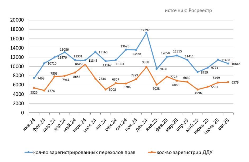 По итогам августа 2025 года Росреестр зарегистрировал 10 645 перехода прав на вторичную недвижимость и 6 579 договоров долевого участия жилой недвижимости. Данные по сентябрю месяцу традиционно ожидаются к середине октября текущего года.