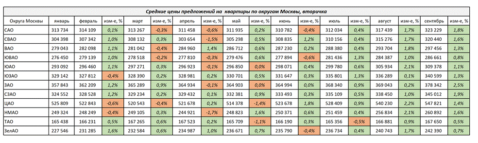 Изменение цен на квартиры по округам Москвы с декабря 2024 г. по сентябрь 2025 г.