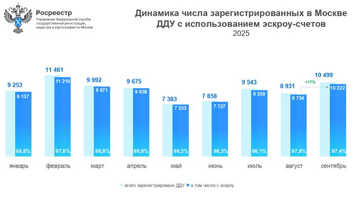 В сентябре 2025 года Управлением Росреестра по Москве зарегистрировано 10 222 договора участия в долевом строительстве в отношении жилой и нежилой недвижимости с использованием эскроу-счетов.