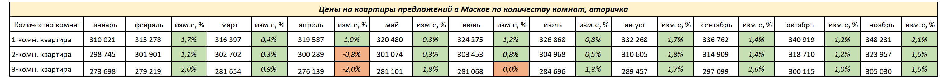 ❇️ Средняя медианная цена предложений на 3-х комнатные квартиры составила 305 030 руб./кв.м., +1,6% по сравнению с октябрем месяцем;