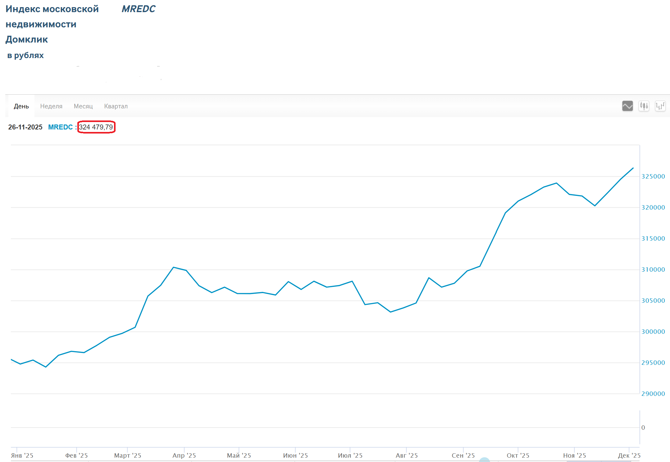 Индекс московской недвижимости Домклик (MREDC), рассчитываемый московской биржей на основании данных об ипотечных сделках Сбербанка, на конец ноября месяца зафиксировался на уровне 324 480 руб. за 1 кв.м., показав рост на 1,3% с начала месяца.
