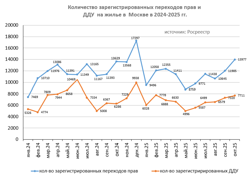 По итогам октября 2025 года Росреестр зарегистрировал 13 977 переходов прав на вторичную недвижимость и 7 711 договоров долевого участия жилой недвижимости. Данные по ноябрю месяцу традиционно ожидаются к середине декабря текущего года.