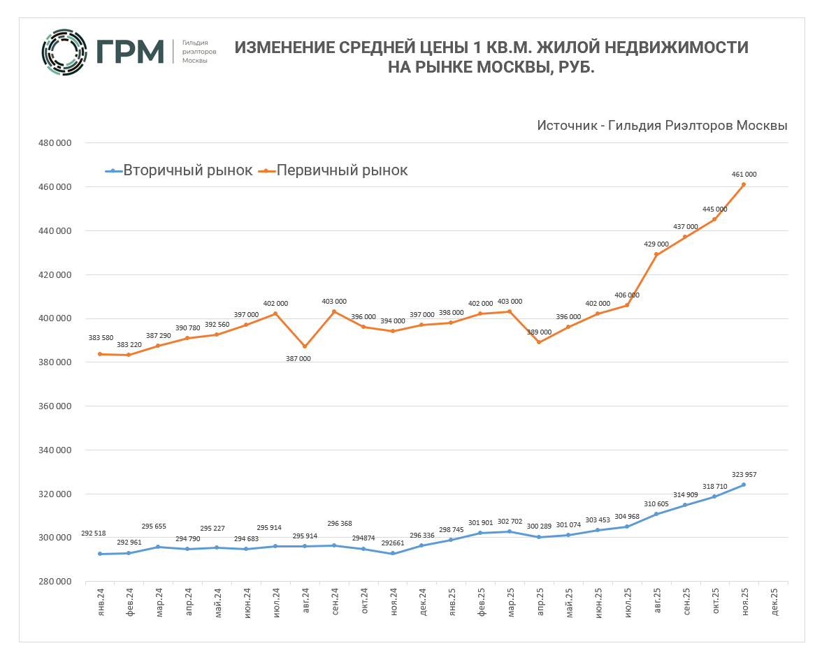 Средняя цена 1 кв. м. на первичном рынке г. Москвы на 30 ноября 2025 года составила 461 000 рублей** (+1,6%)