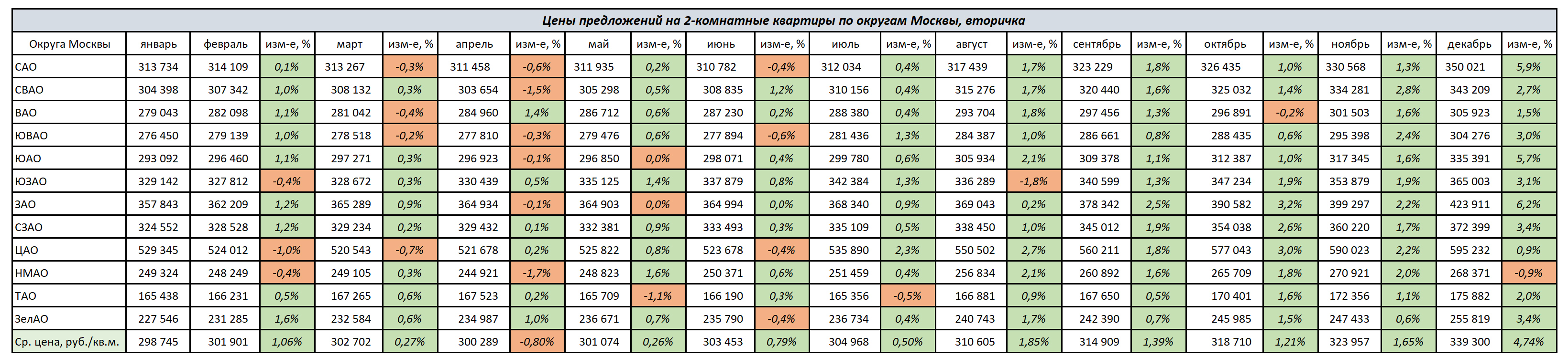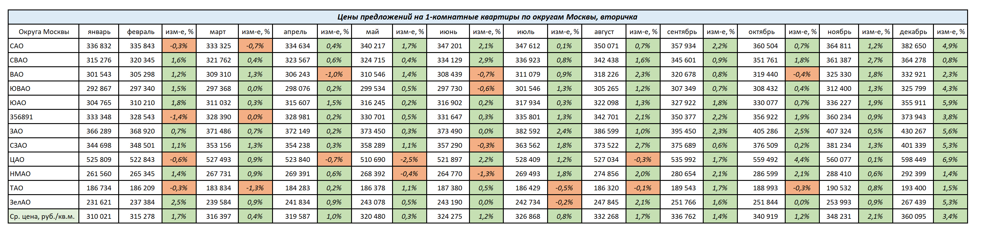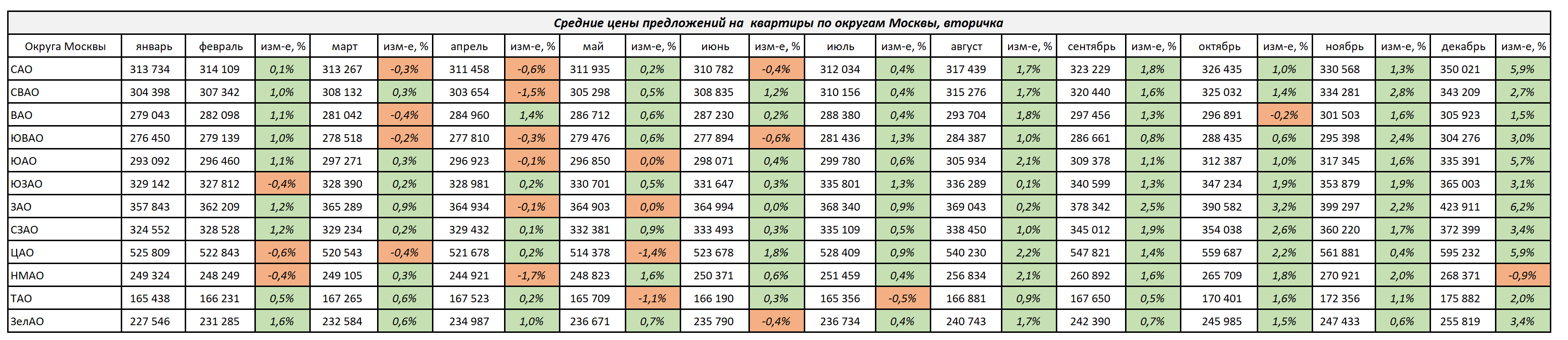 Сводная таблица цен на первичном и вторичном рынке города Москвы