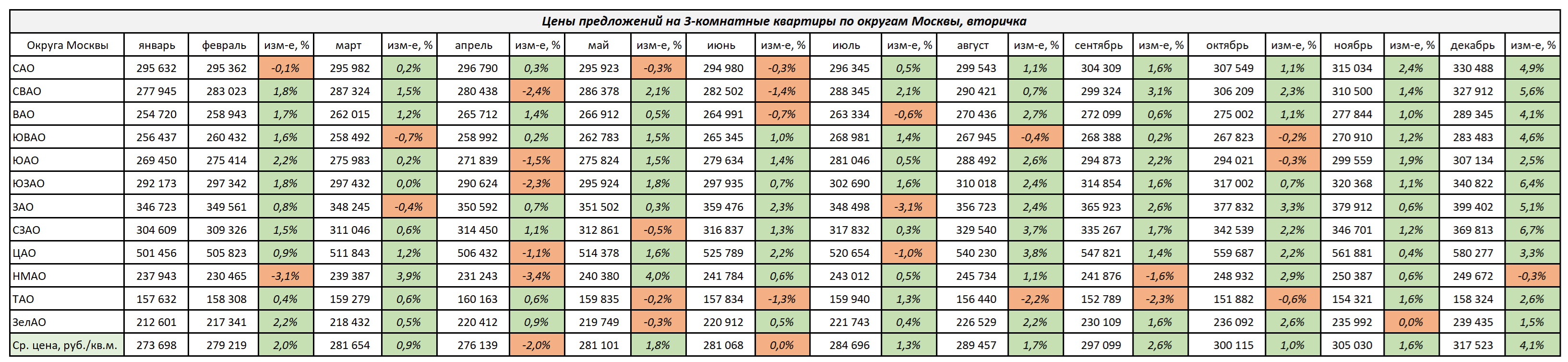 - Средние цены предложений на 3-комнатные квартиры показаны в таблице ниже: