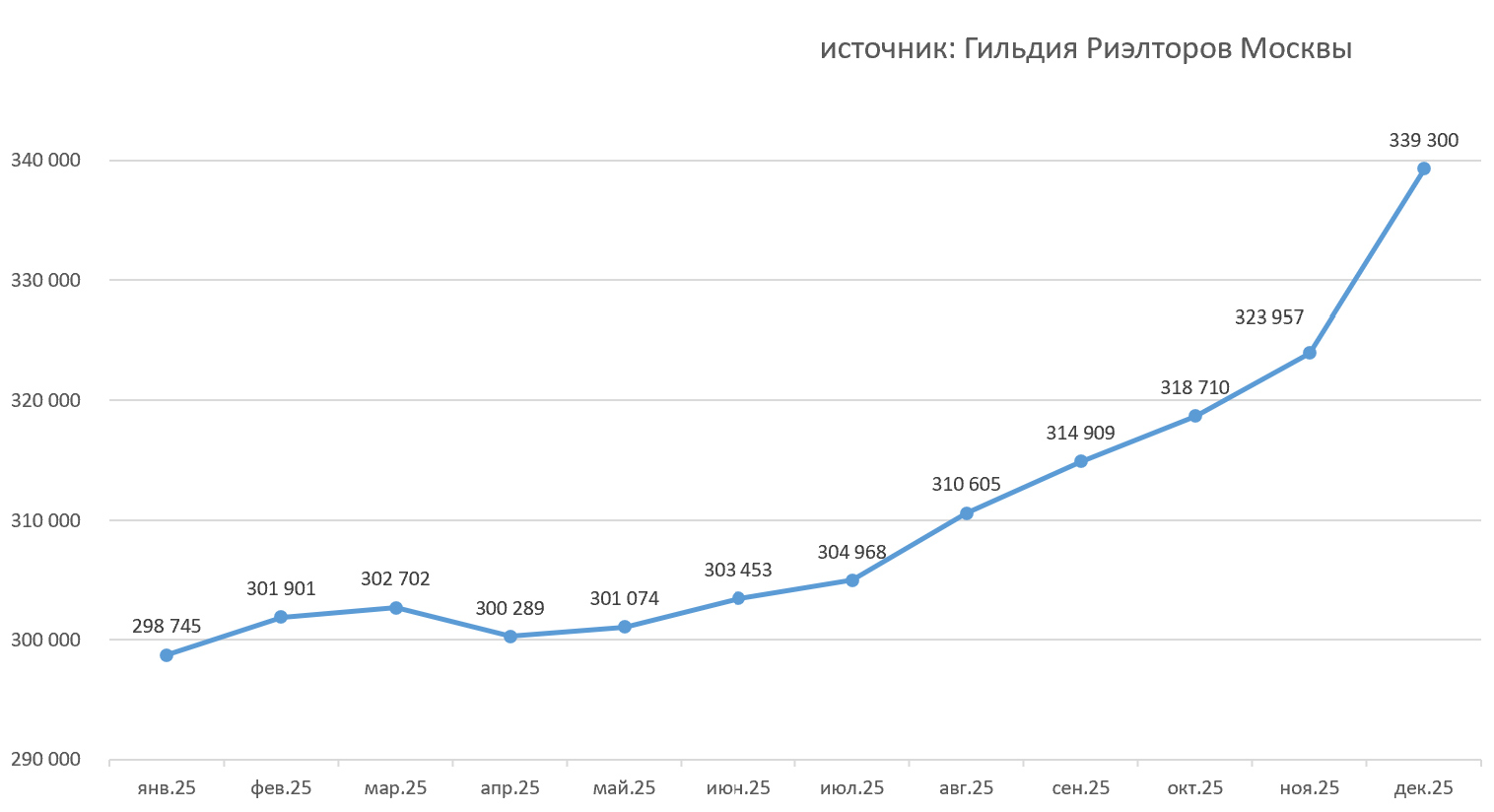 Средняя цена предложения 1 кв. м. на вторичном рынке г. Москвы на 31 декабря 2025 года составила 339 300 рублей (+4,7%)
