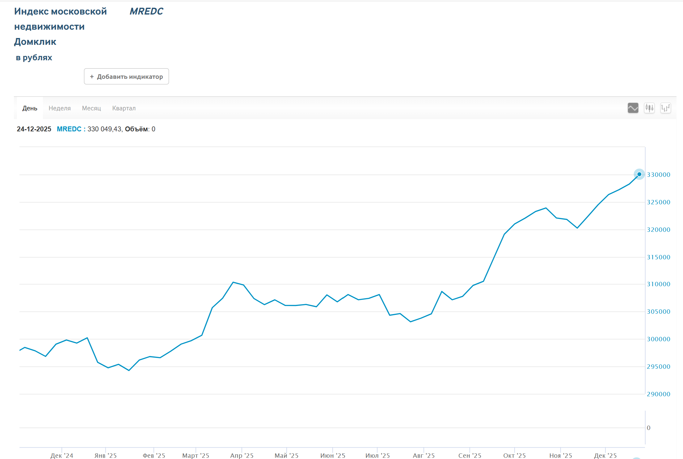 - Индекс московской недвижимости Домклик (MREDC), рассчитываемый московской биржей на основании данных об ипотечных сделках Сбербанка, на конец декабря месяца зафиксировался на уровне 330 049 руб. за 1 кв.м, показав рост на 1,1% с начала месяца.