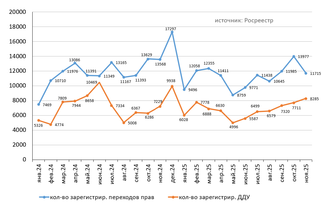 По итогам ноября 2025 года Росреестр зарегистрировал 11 715 переходов прав на вторичную недвижимость и 8 285 договоров долевого участия жилой недвижимости. Данные по декабрю месяцу традиционно ожидаются к середине января следующего года.