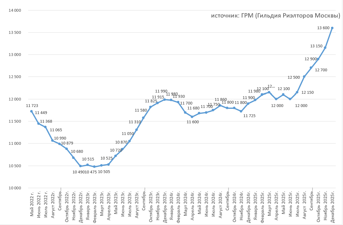- Всего по итогам 2025 года цены предложений на вторичном рынке недвижимости в Москве выросли на 13,5%