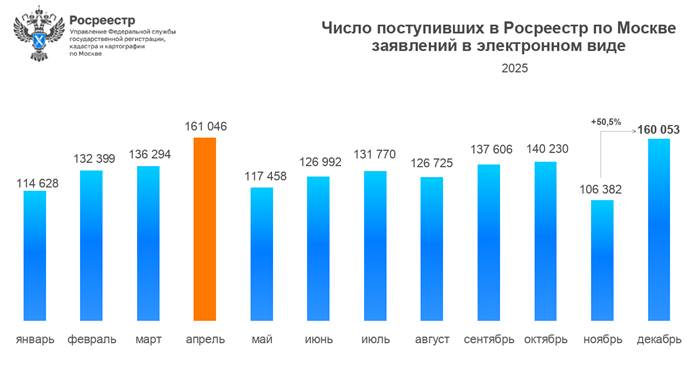 В декабре 2025 года Управлением Росреестра по Москве принято 160 053 заявления в электронном виде. К предыдущему месяцу (106 382) рост составил 50,5%. При этом показатель декабря стал вторым в году после максимального апрельского значения (161 046).