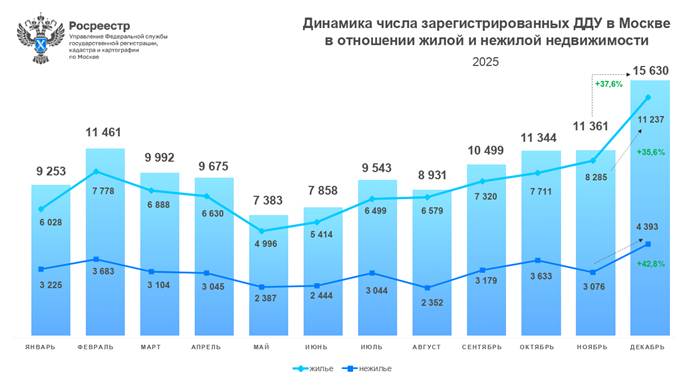 Всего в декабре было оформлено на 37,6% ДДУ больше, чем месяцем ранее (11 361 ДДУ). В жилом сегменте (11 237 ДДУ) число договоров участия в долевом строительстве увеличилось к ноябрю на 35,6%, а в нежилом (4 393 ДДУ) рост составил 42,8%.
