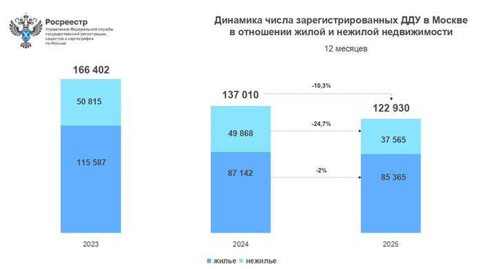 Всего за 12 месяцев 2025 года Управлением Росреестра по Москве зарегистрировано 122 930 договоров участия в долевом строительстве в отношении жилой и нежилой недвижимости. Итогу 2024 года (137 010 ДДУ) показатель уступил 10,3%.